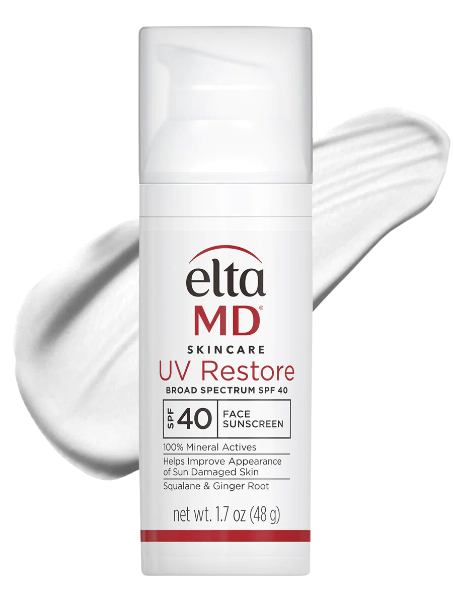 EltaMD UV Restore Broad Spectrum SPF 40, a 100% physical sunscreen that visibly improves sun-damaged skin. Formulated with squalene for natural moisture, ginger root extract, and saccharide isomerate to diminish dark spots and fine lines. Dermatologist-tested and hypoallergenic, it combats aging free radicals from UV, IR, and offers HEV light protection. It is paraben-free, fragrance-free, dye-free, and non-comedogenic